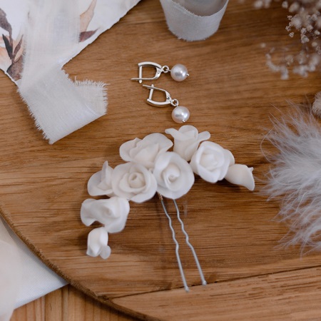 CASSIA pin is made from numerous little roses. Every single petal is entirely hand sculptured in our studio in Switzerland! Just choose the variant to fit your hairstyle the best - as a single big pin or in combination with a smaller pin. The accessories can be ordered with white- and blush-colored flowers, for any other color or customization, dont hesitate to contact us.